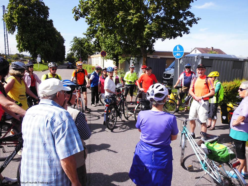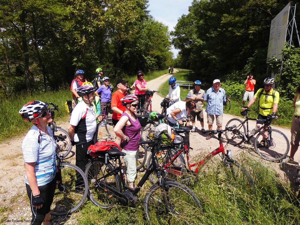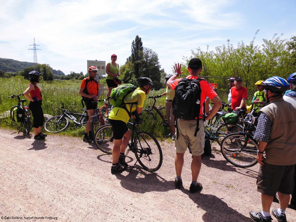 Aufgrund der großen Anzahl und einiger nicht sehr geübter Radler benötigten wir für die rund 25 Kilometer lange wunderschöne Strecke entlang des Rheins mehr als zwei Stunden. Zwischendurch informierte uns Gabi Rolland, Vorsitzende der NaturFreunde Freiburg, sehr interessant über den Hochwasserschutz am Beispiel der hier erbauten Rückhaltebecken. Das hatte zur Folge, dass unsere Schweizer, die bereits um 09:15 Uhr für die 16 Kilometer gestartet waren, bereits ihr wohlverdientes Mittagessen bekamen, als wir gerade eintrudelten. Für uns reichte dann die Zeit nicht mehr zur Teilnahme an der gemeinsamen Führung durch die Orchideenwiese (Totengrien), denn Hunger und Durst hatten wir auch und bei dem größeren Andrang war die Sportgaststätte ein wenig überfordert.